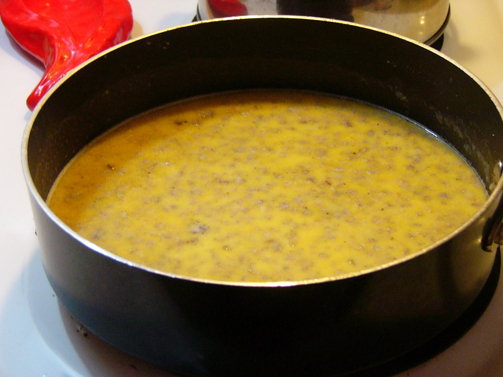 To the now empty skillet, melt butter until just beginning to bubble. Sprinkle flour over butter and cook, stirring constantly, until lightly golden. The key to any gravy or thick sauce is a well-prepared rouge. The flour must be cooked without overcooking to get rid of that “flour paste” flavor. (I like Wondra Flour for gravies and sauces because it blends so easily. Depending upon the dish, I’ve even used Wondra when a recipe calls for cornstarch as a thickening agent. No, I’m not a spokesperson for Gold Medal – but when I find something I like and it makes life a little easier, I don’t mind singing their praise).