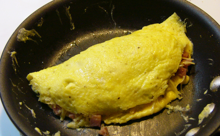 You can put just about anything into an omelette. Fry up some bacon, crumble it and keep it warm – that’s a good filling. Chop vegetables, sauté until tender but crisp – that’s a good filling. Chopped ham, dices red onions and mushrooms (today’s selection) is probably the most common, basic omelette filling. Mix it all together for a flavor-packed omelette. Another wonderful filling is left over taco meat. Add a little salsa as a garnish and you’ve got a kicking South of the Border delight. I once met a woman who filled her omelettes with fried hot dogs. As I always say, the sky’s the limit!