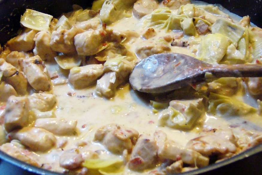Marinated Artichoke-Chicken Fettuccine with Smoky Bacon