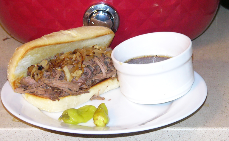 When I came home, my kitchen smelled wonderful. The roast was dark and tender, cooked to perfection. As I took the meat from the pot, I realized that the juices were packed with flavor – perfect for using as a dip. So I made my Italian Roast Beef Sandwiches with a French Dip flare. Man oh man – it was so delicious! The only sounds at dinner that night were lots of “yums” as we savored every moist morsel.