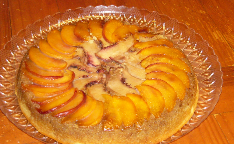 On a beautiful Saturday morning this past summer, Hubby and I were at our local Farmers Market. I love wandering around the market, with all the colors and smells of fresh picked fruits. One stand in particular had the most luscious selection of yellow and white peaches. At fifty-cents a peach, how could I resist? Besides, we were having a wonderful country-style barbecue later that day, and what could be better than a southern-style up-side-down cake for dessert? (Isn’t it funny that we think of the south when we think of peaches? You know, Georgia Peach – yet peaches actually were first cultivated in China.) Hubby and I picked out several of each, some for baking, some for eating. These peaches were packed with juice, and eating them became a sticky proposition. Hubby finally resorted to eating his peach over the kitchen sink.