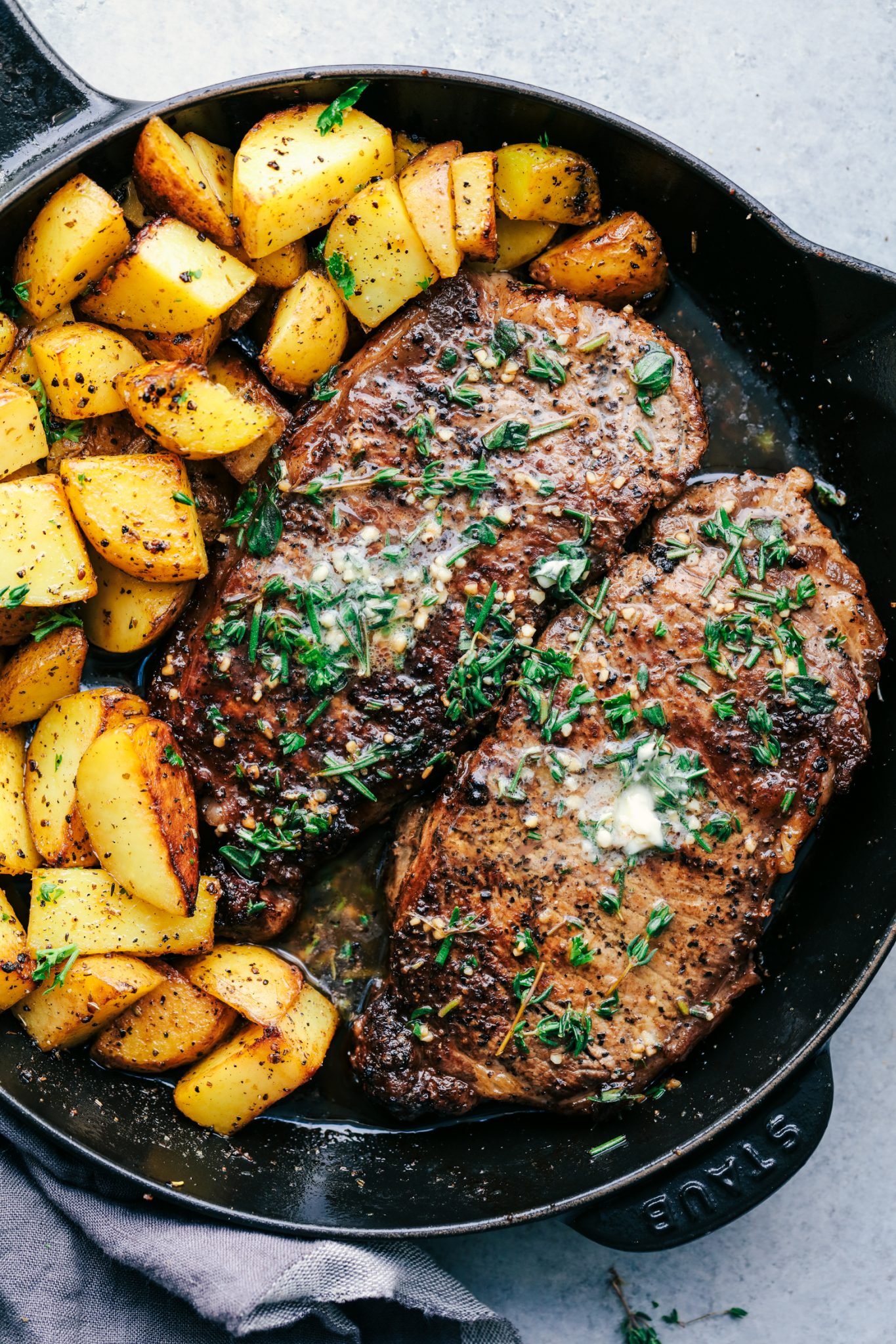 Pan Seared New York Strips with Garlic Butter and Grilled Potatoes