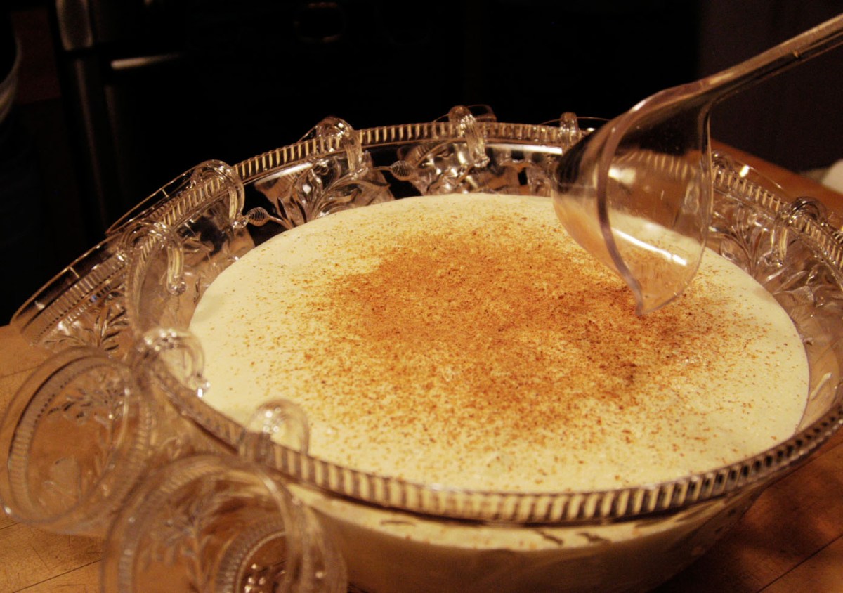 Transfer eggnog to a decorative punch bowl and serve well-chilled. If desired, sprinkle top with a little cinnamon for contrasting color and additional spice.