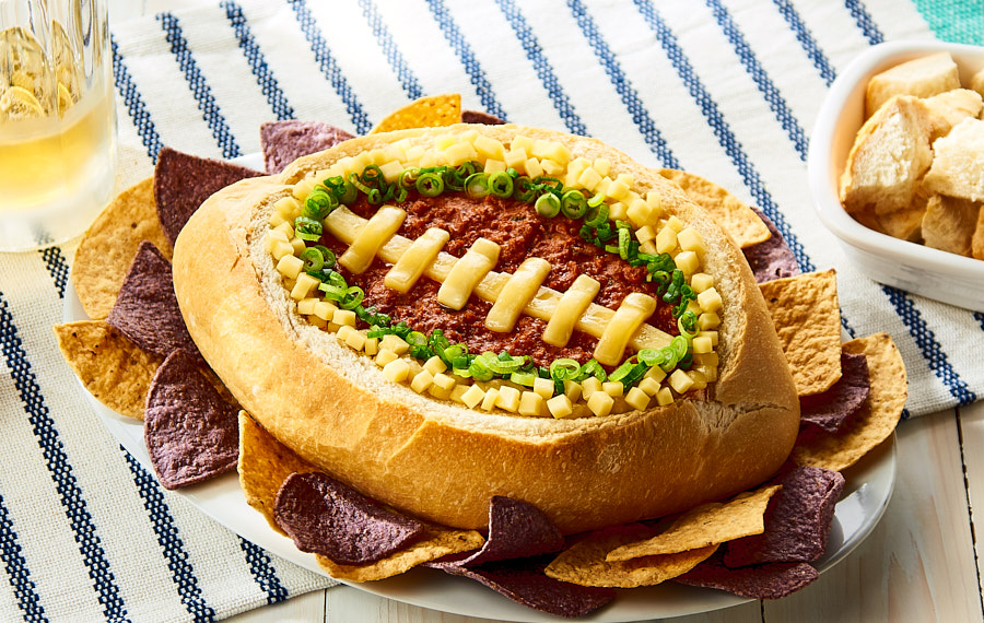 Once the bread bowl is ready, trim sides for more room. Fill with meat filling. Garnish with cubes of cheese and green onions. Arrange on a platter with chips for dipping.