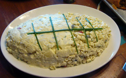 Line football baking pan with plastic wrap. Fill half of the pan with Macaroni Salad. Fill remaining half of the pan with Potato Salad.