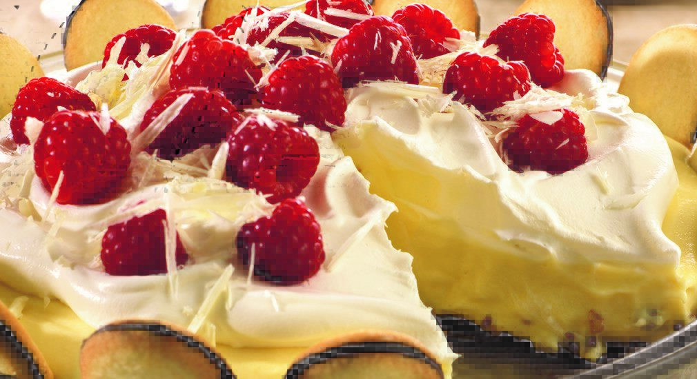 Top with remaining cup of Cool Whip. Garnish with raspberries and shaved chocolate.