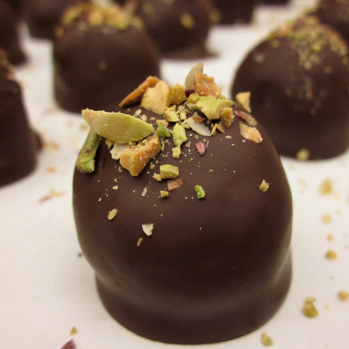 Melt bittersweet chocolate in double boiler. Once completely smooth remove ganache from freezer. Carefully slide the parchment with ganache off the baking sheet and place a clean sheet of parchment on the baking sheet. One at a time dip the ganache into bittersweet chocolate and coat completely. Place on frozen parchment lined baking sheet and sprinkle with chopped pistachios. Repeat until all pieces have been coated and return the sheet to the freezer for one hour.