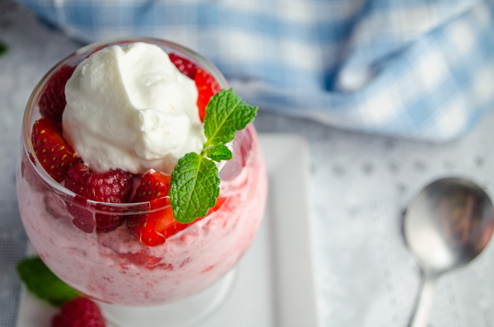 This would also make for a very elegant 4th of July Dessert. It is cool, refreshing and red, white and blue (if blueberries are used). To emphasize the Red White and Blue theme, omit the mint leaves and place 1 or two blueberries on top with the strawberry.