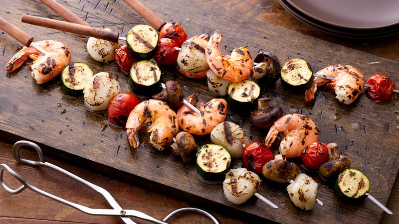 Thread scallops, shrimp, mushrooms, tomatoes and zucchini alternately on each of four 10-inch metal skewers. Brush with lemon juice mixture.