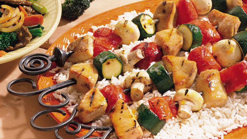 Lightly oil the grill grate. Place the skewers on the grill. Cook for 12 to 15 minutes, until chicken juices run clear. Turn and brush with reserved marinade frequently.