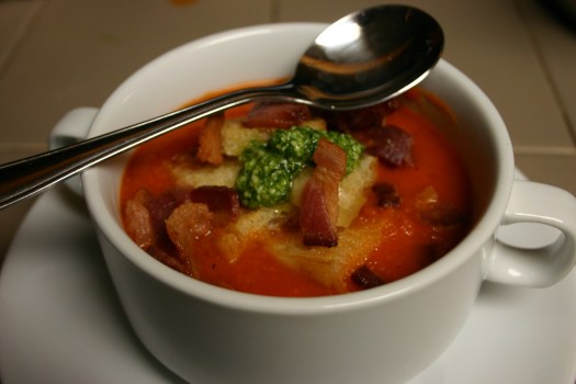 BLT Soup with Sourdough Croutons and Arugula Pesto