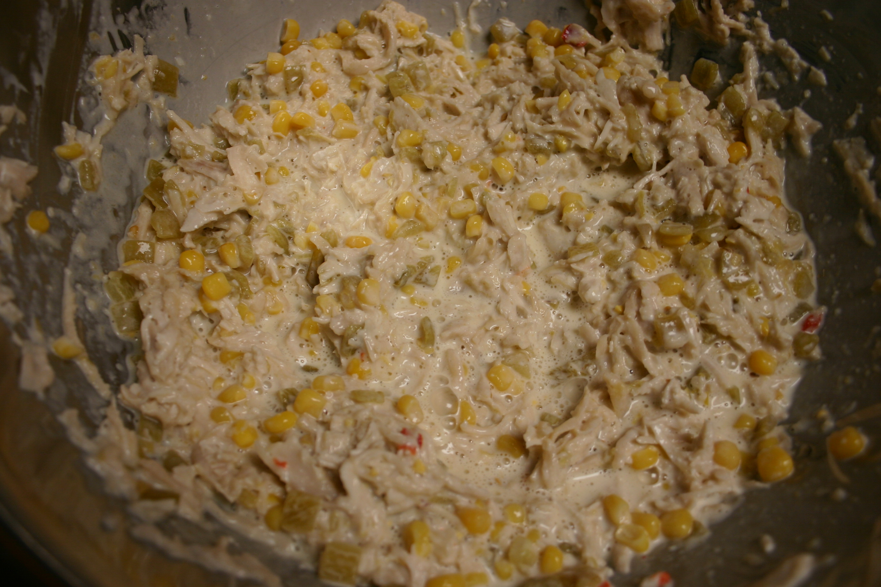 Add chicken, sweet corn, green chilies and 1 cup of the Mexican cheese blend, stirring to combine.