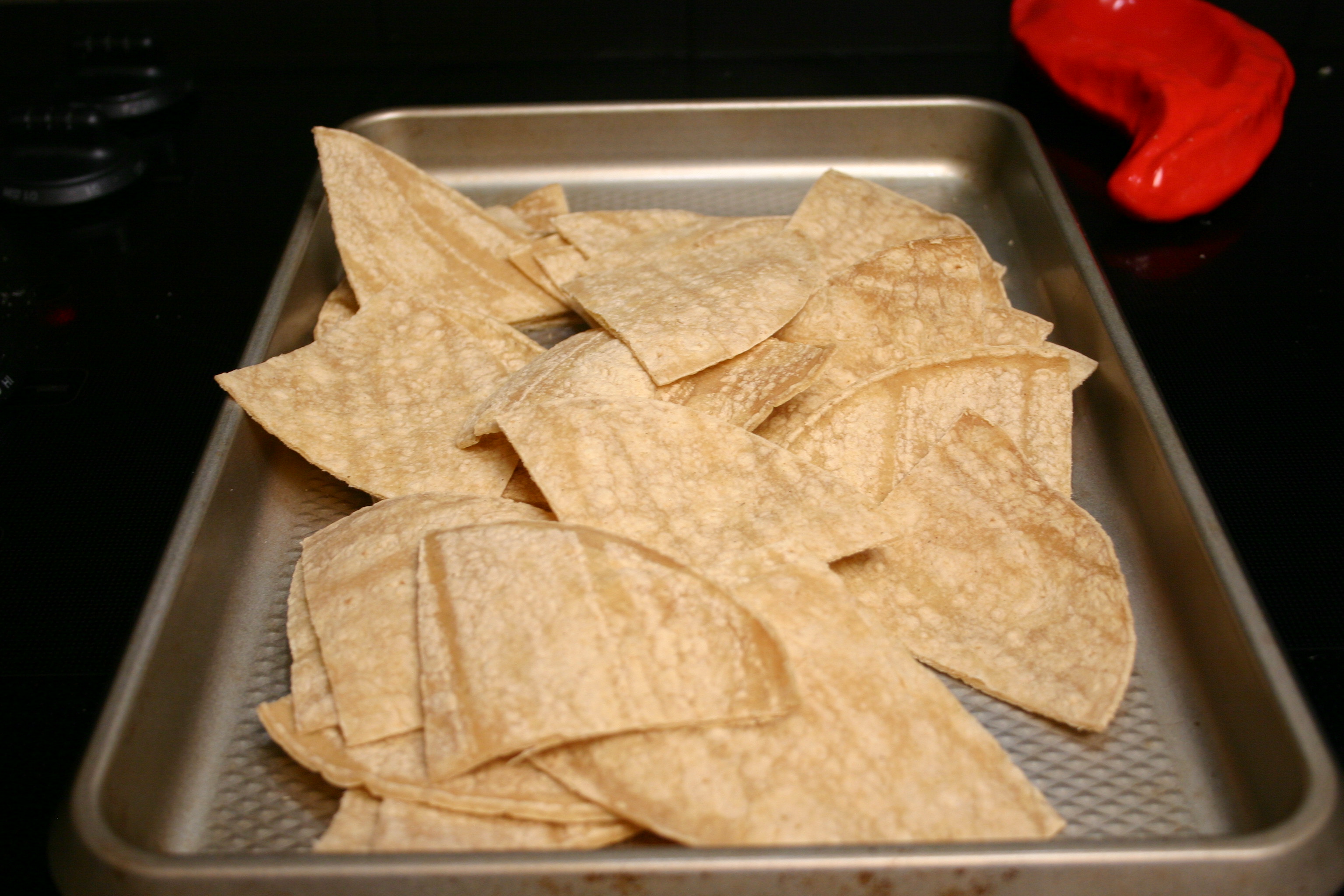 Lay corn tortillas out overnight or early in the morning to dry out. Using a pizza cutter, cut tortillas into triangle chips.