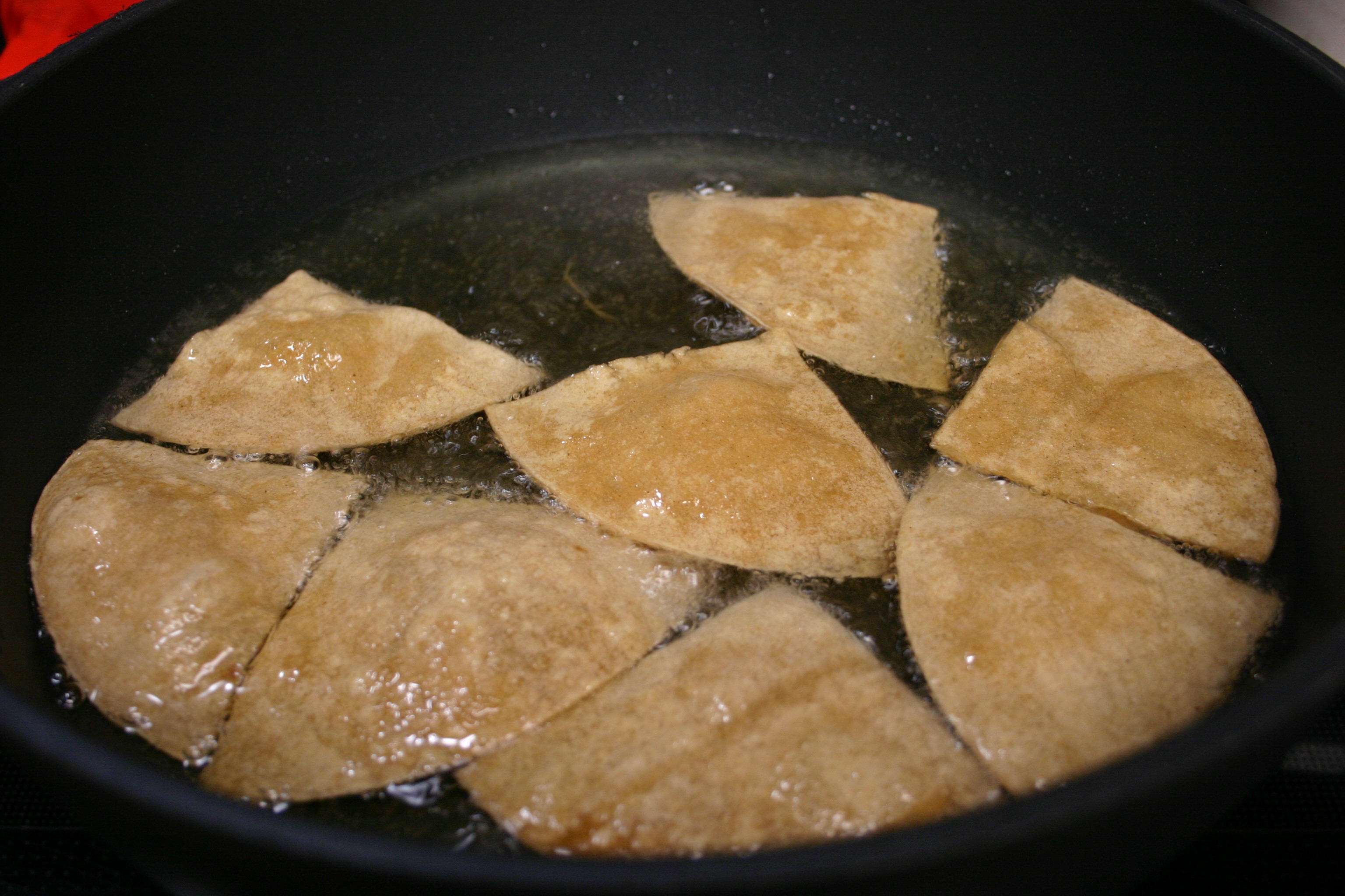Heat oil in a heavy bottom skillet. Once hot, fry tortillas in batches. Place on paper towels to drain. Season with salt while still hot. Transfer to baking pan and keep warm until ready to serve.