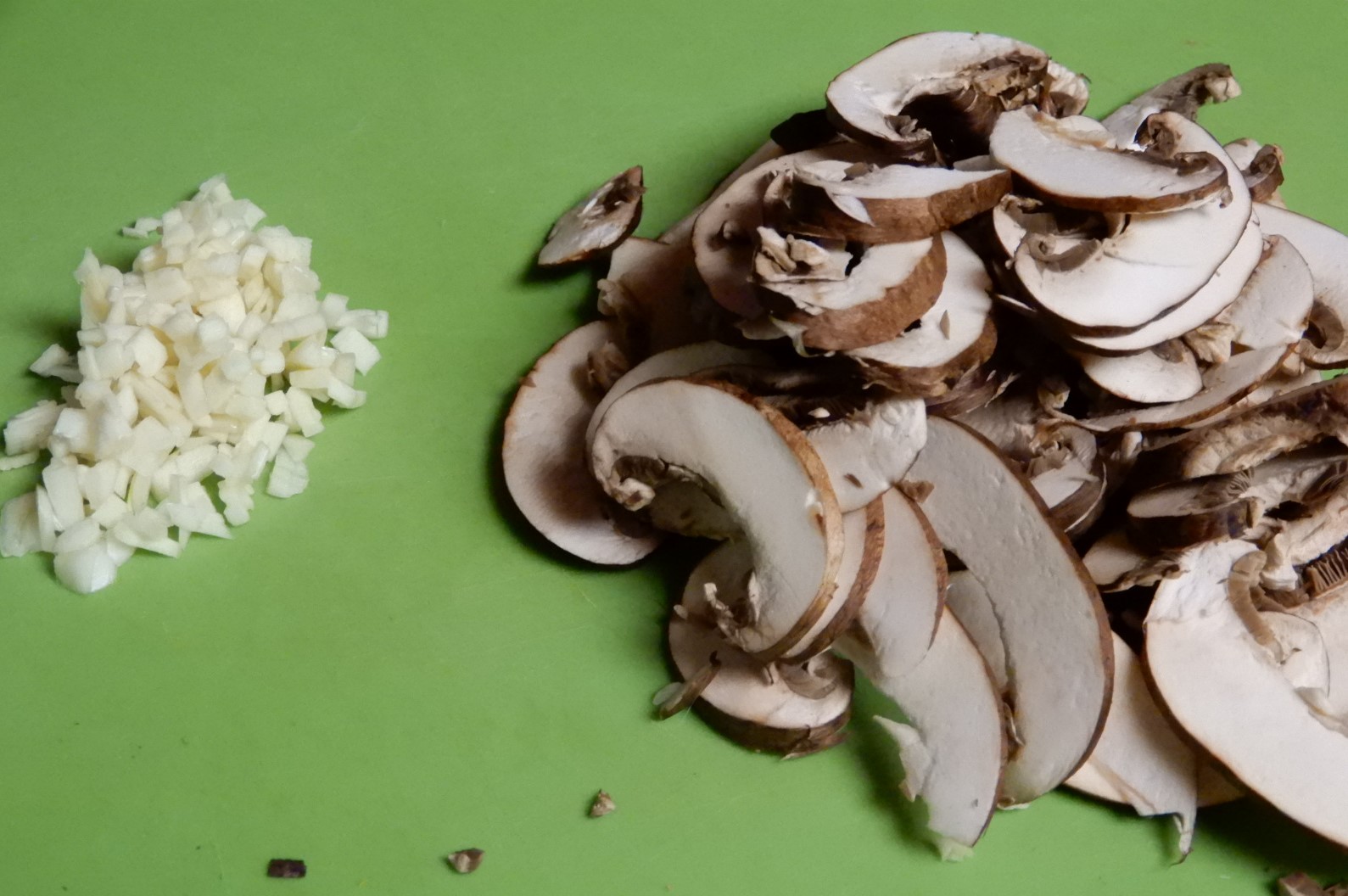 Bring a large pot of water to a full boil. Cook pasta until al dente, about 11 minutes. Meanwhile, cut chicken into strips. Set aside. Slice mushrooms. Set aside. Finely mince garlic cloves. Set aside.