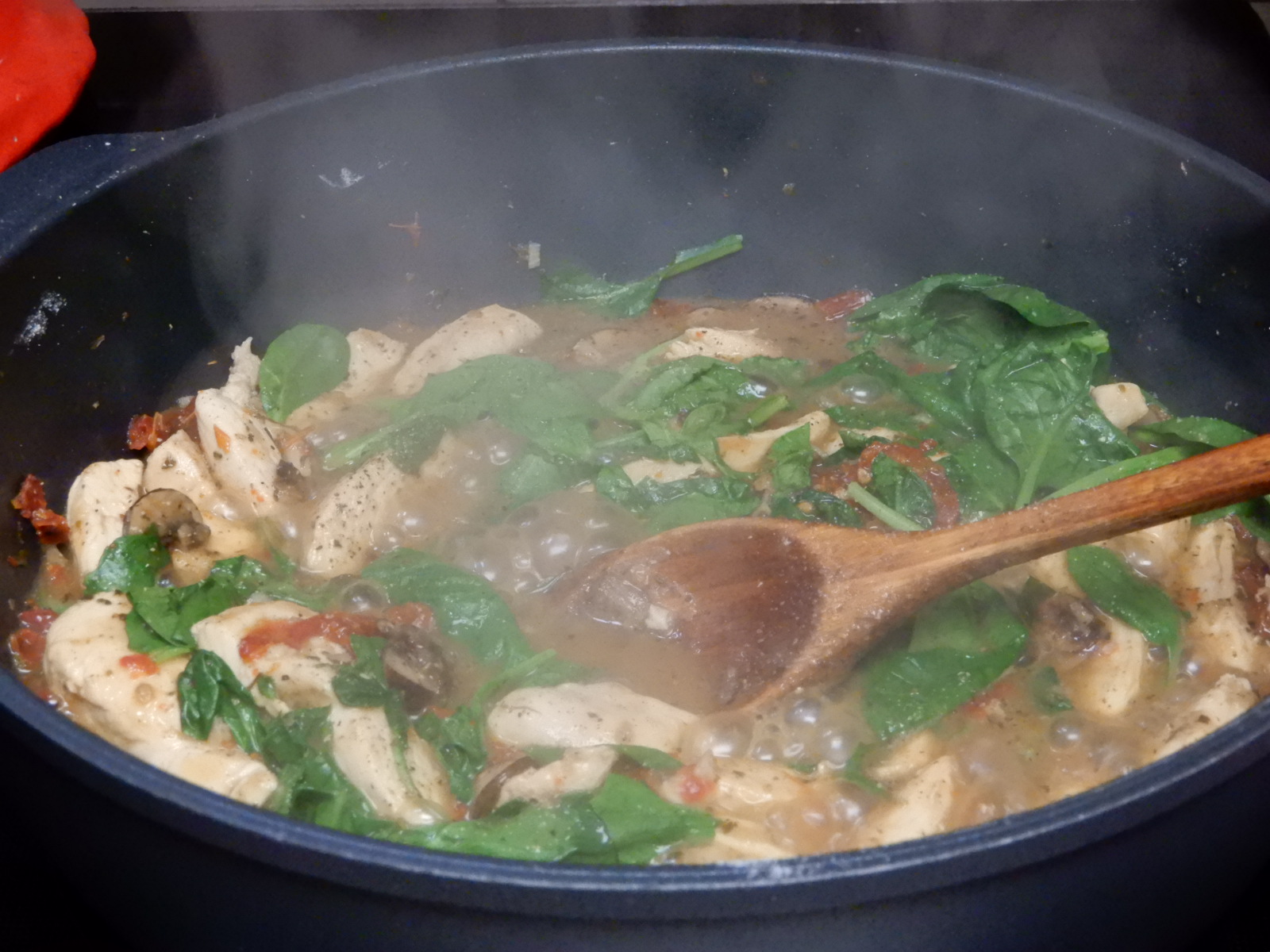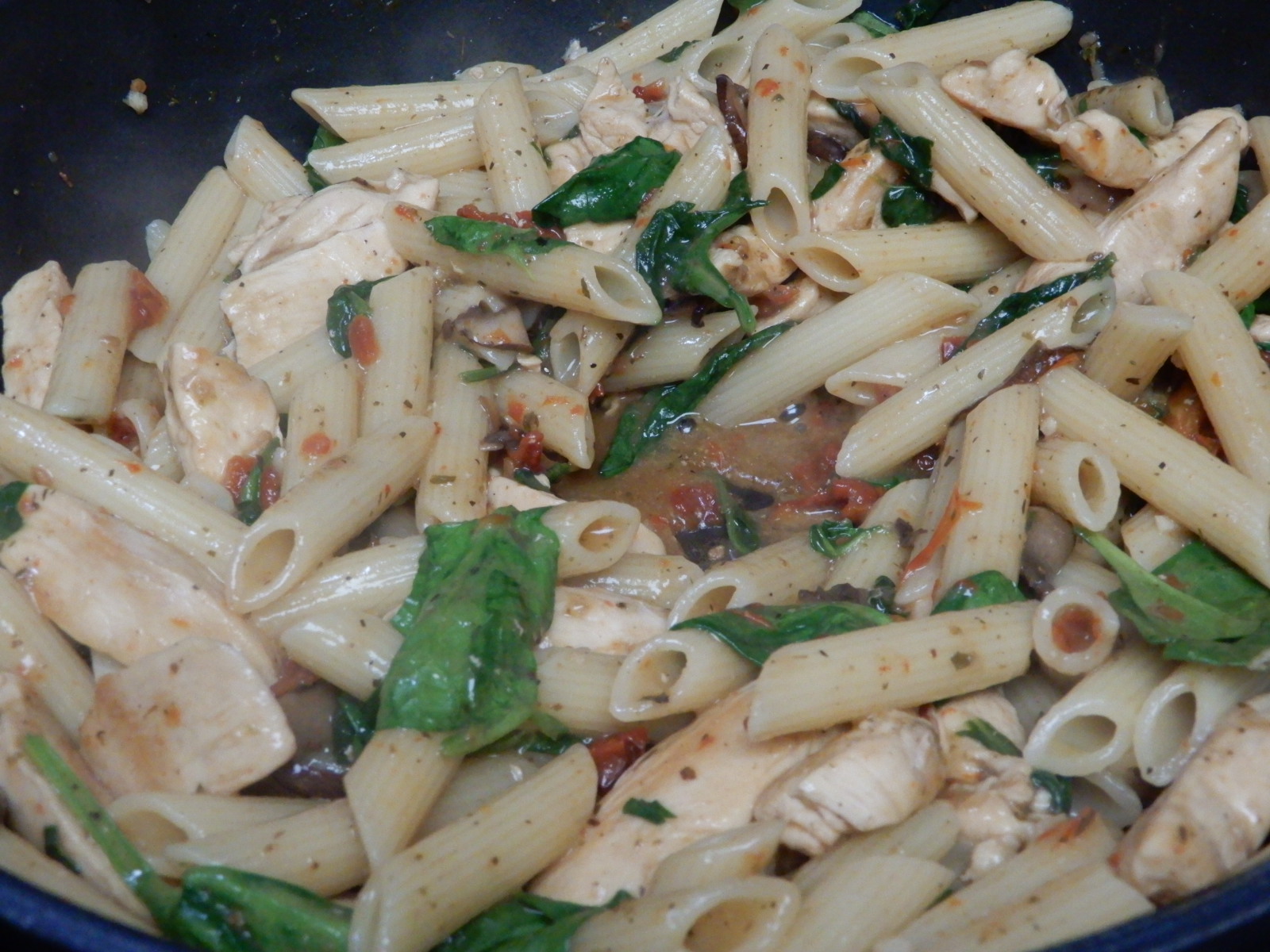 Oh but wilt some spinach in a pasta dish and it’s a whole different ball-game. I really like the flexibility of adding as much spinach as you want, and the use of Sun-Dried Tomatoes.