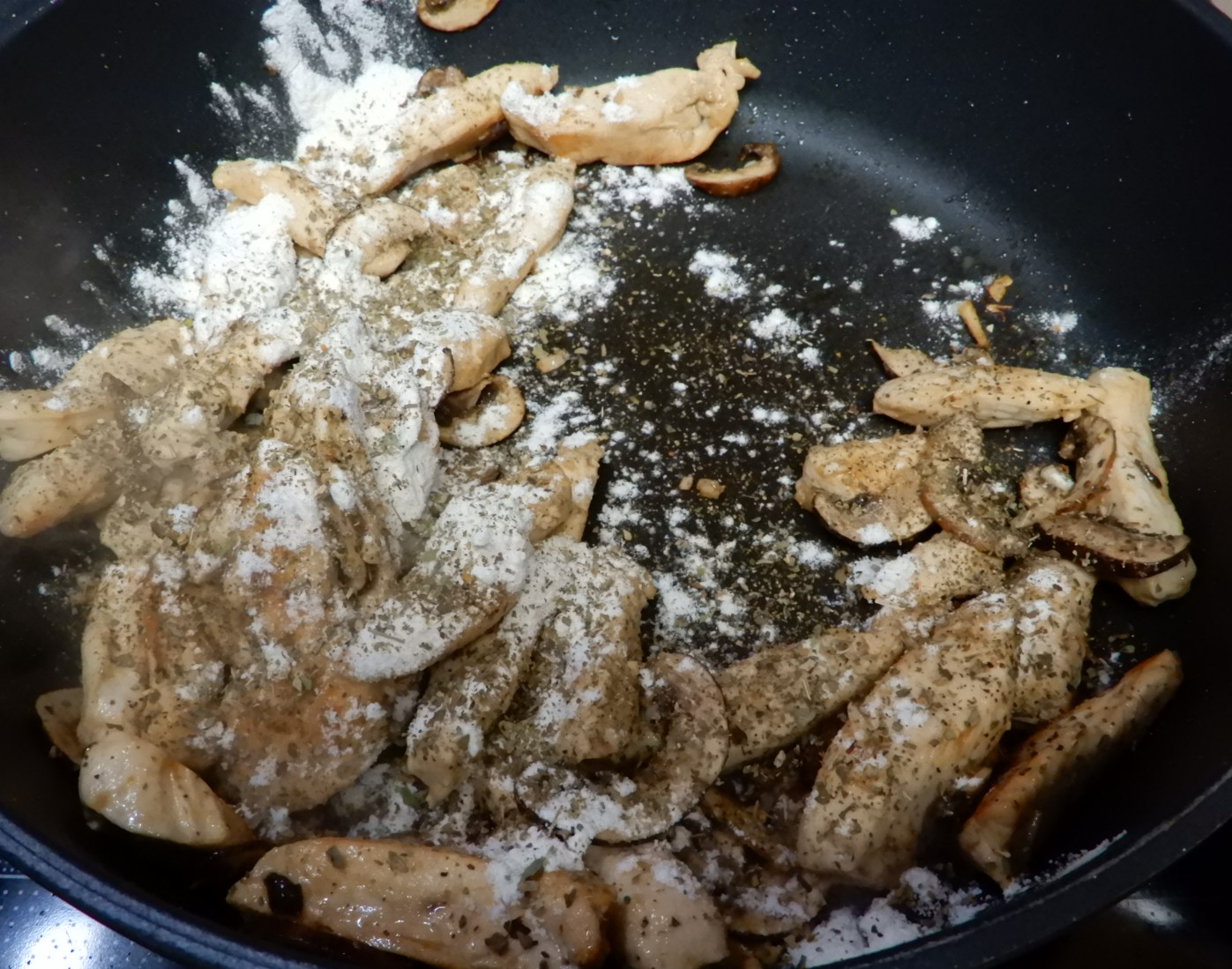 Add the mushrooms and garlic and cook until they’re tender. Stir in the flour and Italian seasoning. Cook and stir for 1 minute.