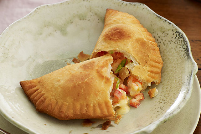 Spoon about 1/3 cup shrimp mixture onto center of each round; moisten edge with water. Fold dough rounds in half to enclose filling; press lightly on tops to remove air pockets. Seal edges with fork.