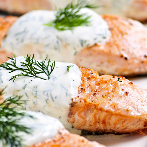 Next Image Cooked salmon fillets with dill sauce on white plate Cooked salmon fillets with dill sauce on white plate
