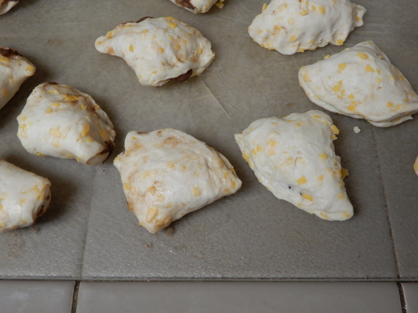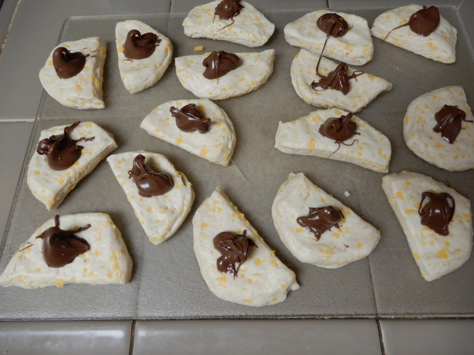 Place about 1/4 teaspoon of Hazelnut Spread into the center of each biscuit half. Pull biscuit dough over the filling, pinch closed to create 16 half-moon Beignets.