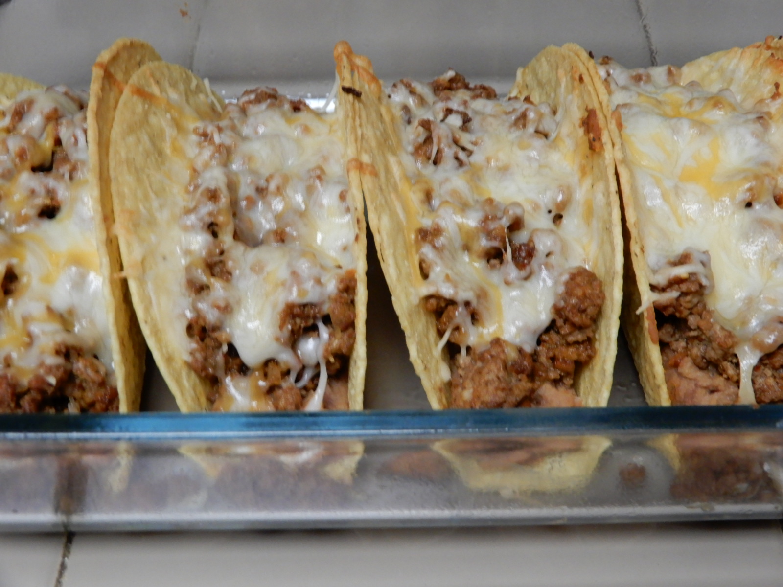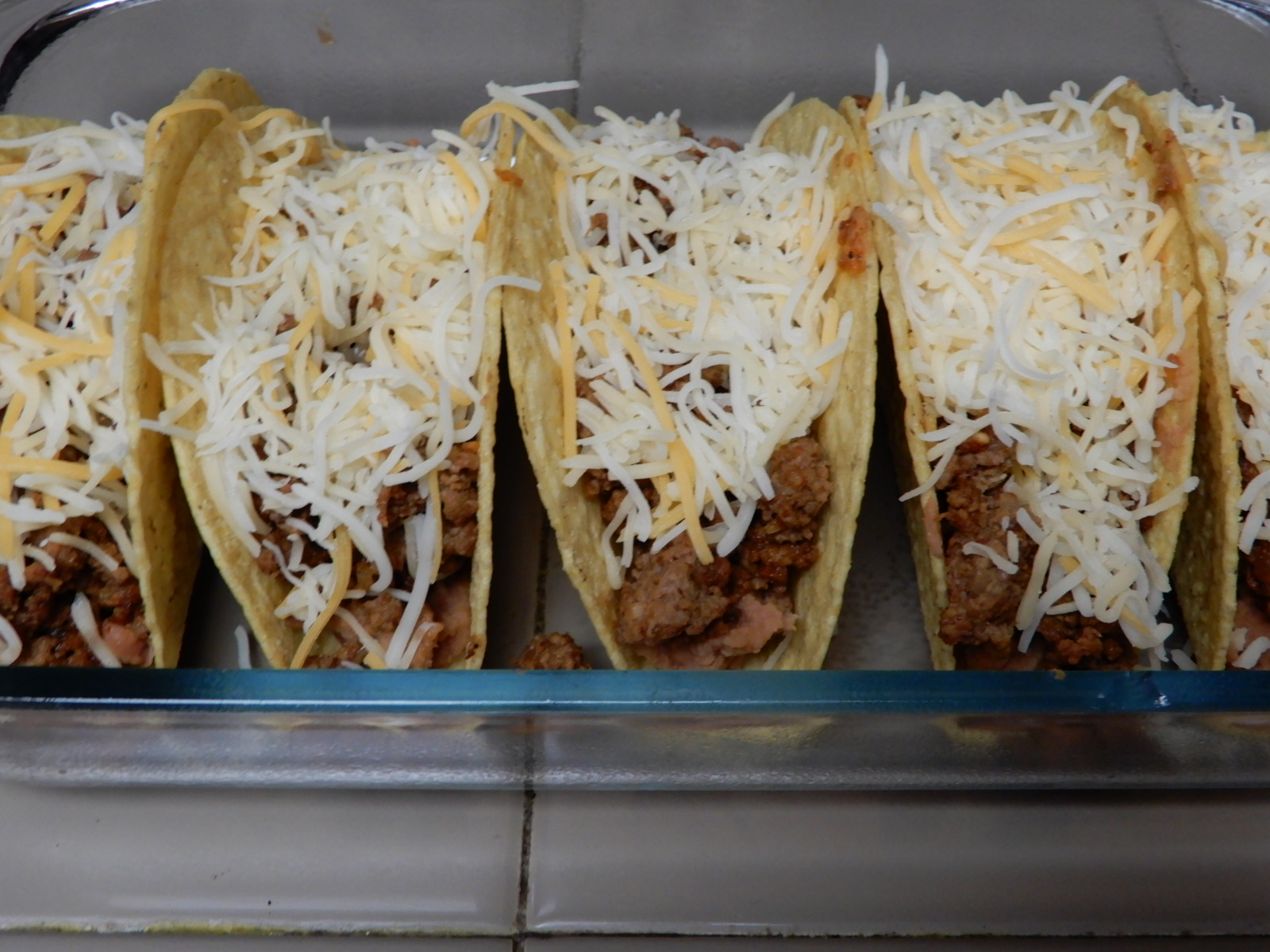 To assemble, spread about 2 tablespoons refried beans in bottom of each shell. Top each with heaping 1/4 cup beef mixture and 2 tablespoons shredded cheese. Bake 5 to 7 minutes or until cheese is melted.