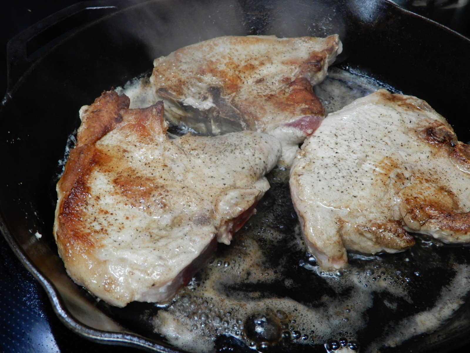 Generously season pork chops with salt and pepper. Sear chops for about 2 or 3 minutes per side for a nice crust.