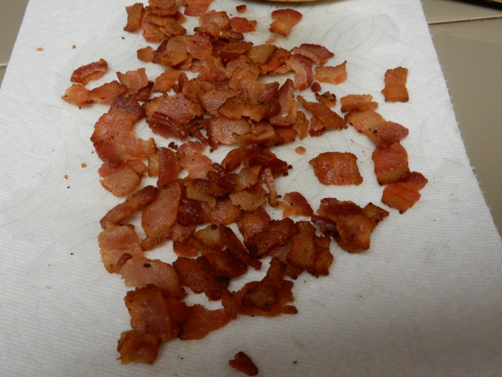While the pasta cooks, fry bacon. Drain, crumble and set aside. If using chicken that needs to be shredded, now would be the perfect time to do so.