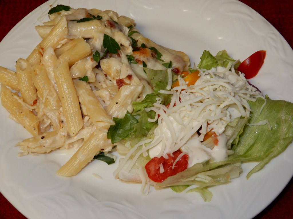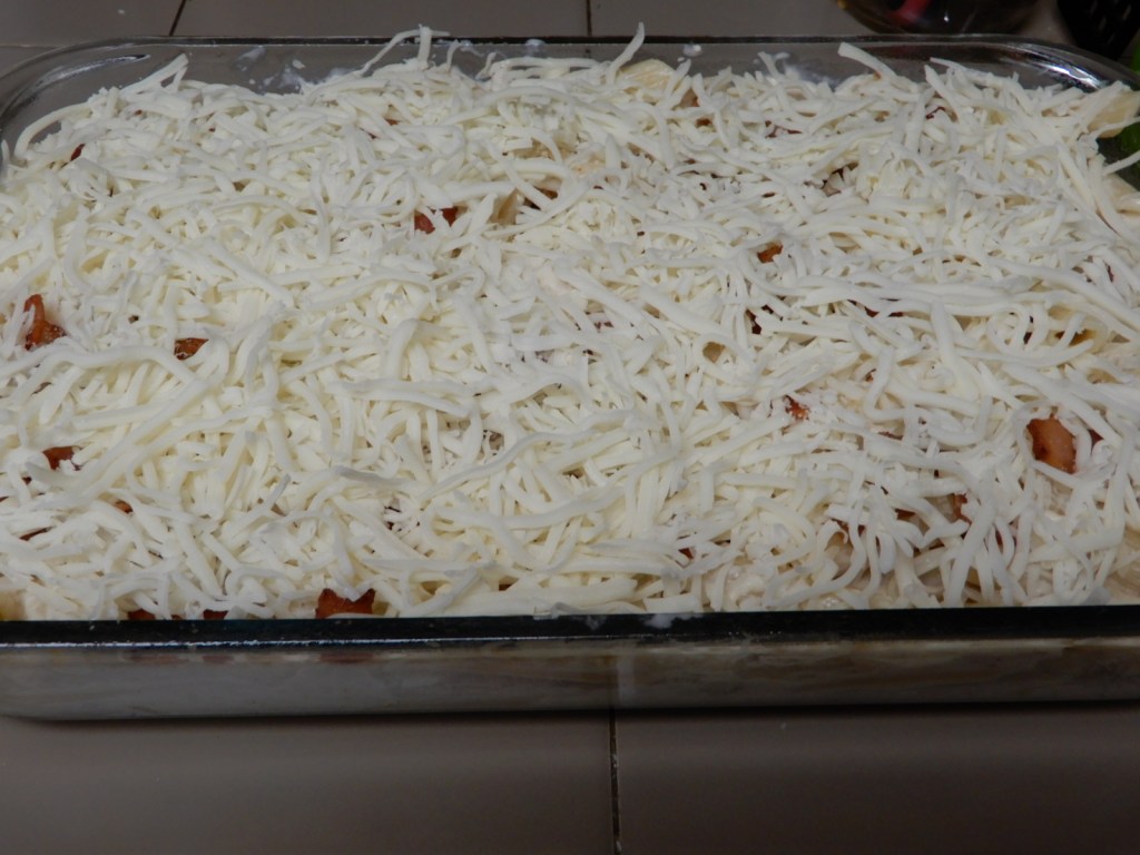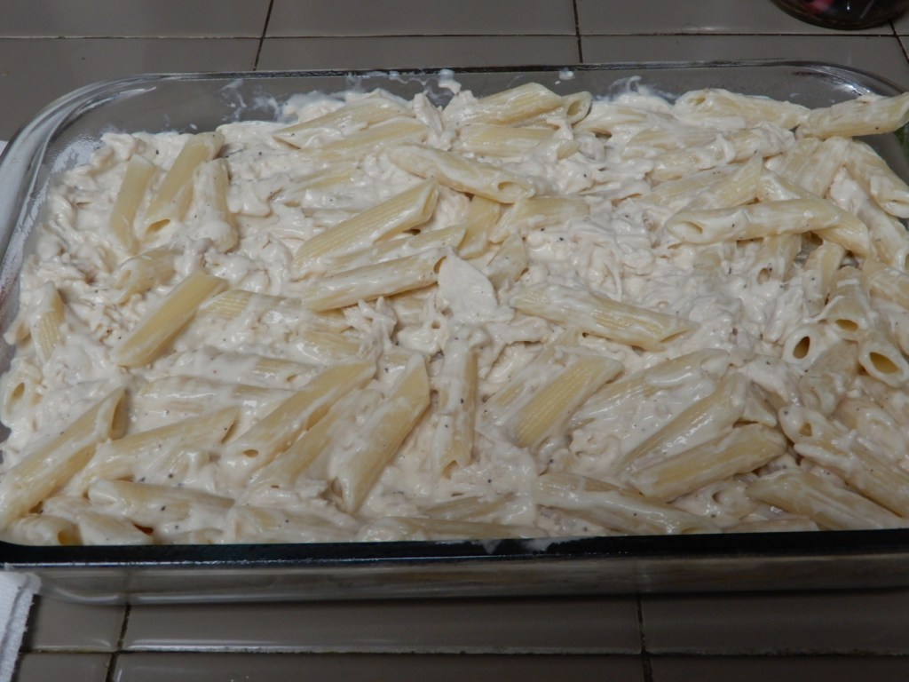 In large bowl, mixt the shredded chicken, Alfredo sauce and ranch dressing. Stir to combine. Once the pasta has drained completely, add it to the chicken mixture. Stir well to combine, then pour mixture into the prepared pan; spread evenly.