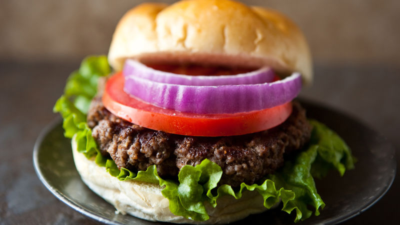 While the burgers are grilling, break off lettuce leaves from a head of green leaf lettuce. Rinse and pat dry. Slice a large tomato into 4 thick slices, set aside. Cut onion in half through the middle, then cut two rings from either half. Break apart and set aside.Serve burgers on buns with lettuce, tomato, and onion. Top with desired condiments such as mustard, mayonnaise and ketchup.
