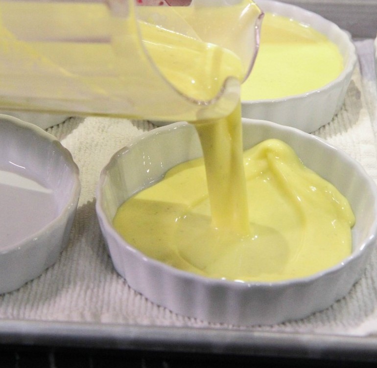 Heat oven to 300-degrees. Line a roasting pan or high-rimmed baking pan with a clean kitchen towel. (The towel will insulate the bottom of the ramekins and protect the custard from the intense heat of the pan). Evenly arrange the 6 ramekins in the roasting pan, set aside. Bring a kettle of water to a boil.