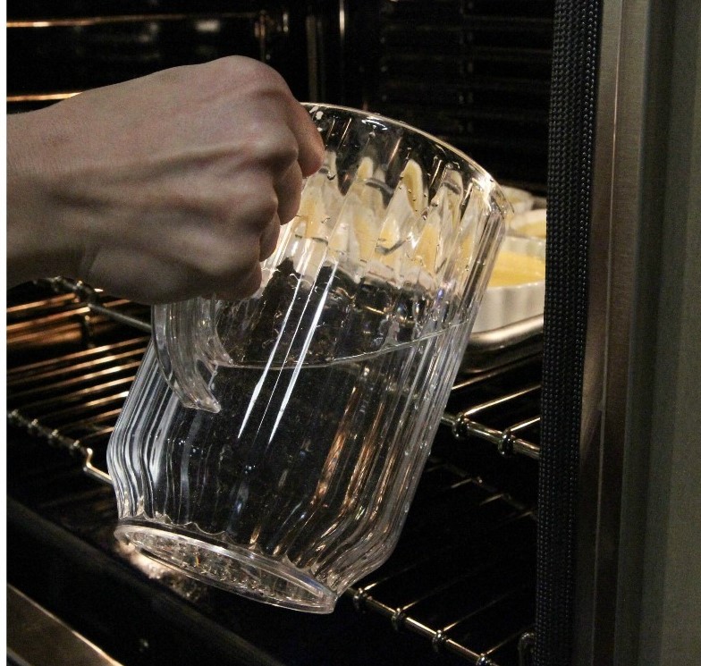 Divide the custard between the ramekins, filling as close to the edge as possible. Place the pan into the oven. Carefully add the boiling water to the pan to create a water bath (bain-marie). Take care not to allow any of the water to splash into the ramekins.