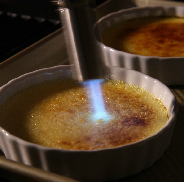 When ready to serve, remove from the refrigerator. Gently dab the tops of the custard with a paper towel to remove any moisture on condensation. Evenly sprinkle the tops with a thin layer of granulated sugar. Shake the ramekins back and forth to distribute the sugar evenly. Tap out any excess sugar. The layer should just cover the top of the custard while almost allowing the custard to be seen. Use a kitchen torch to burn the sugar, moving evenly across the surface until the sugar is caramelized. It should be a golden crisp cap over the custard.