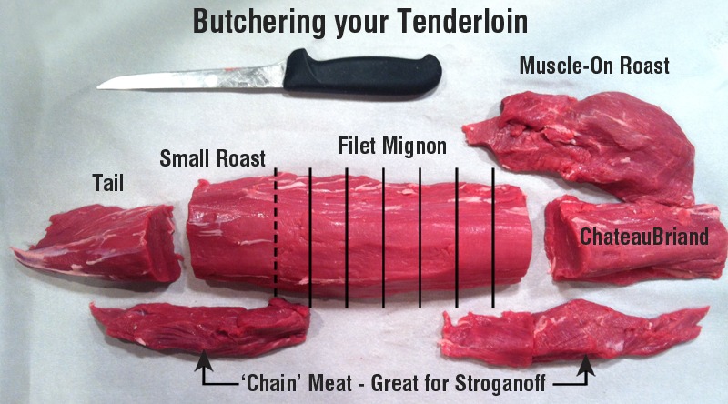 Tenderloin is technically part of the Loin, but not to be confused with Top Sirloin or other cuts from the Loin. And Filet Mignon is not the only cut taken from the Tenderloin. If you can, buy whole and butcher your own. If not, buy from a butcher you trust. If there are streaks of fat or gristle in your Filet Mignon, it’s not the real deal from the center of the tenderloin, closer to the narrow tip.