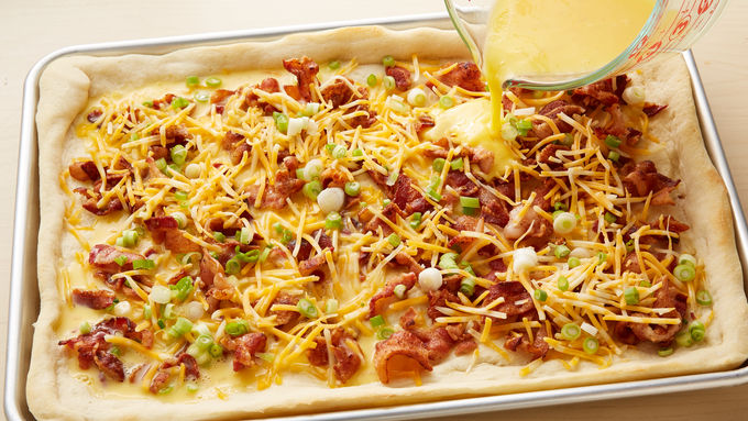 Sprinkle bacon over baked crust. Top with 1 cup of the cheese and the green onions. Beat eggs in 4-cup glass measuring cup, and carefully pour eggs over cheese and green onions.