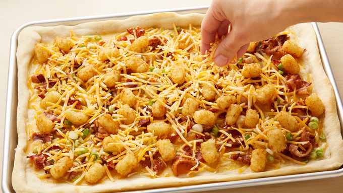Spread Mini Tots on ungreased 15 by 10 by 1-inch pan and bake for 15 to 20 minutes or until crispy and golden brown. Transfer tots to plate; set aside. Allow pan to cool about 10 minutes, and wipe any crumbs from pan.