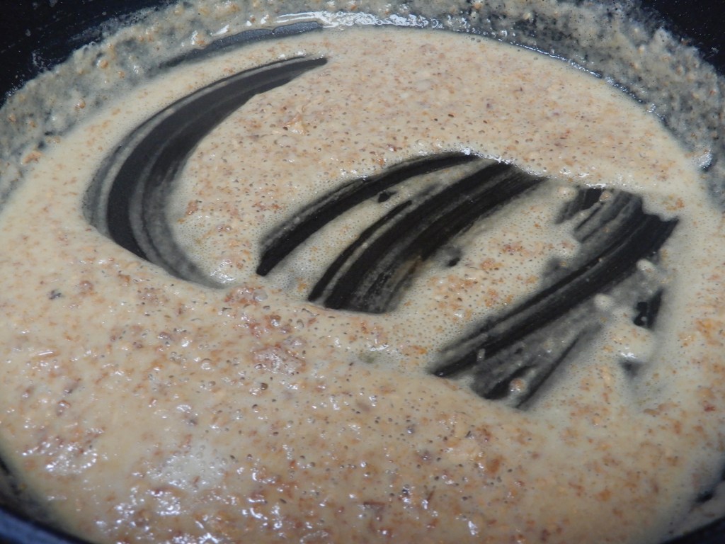 Add garlic to the empty skillet. Quickly sauté garlic, about a minute, scraping up any browned bits. Add flour, cook for about a minute. Add butter, lower heat and create a garlic roux. Let darken to creamed-coffee color, about 2 or 3 minutes.