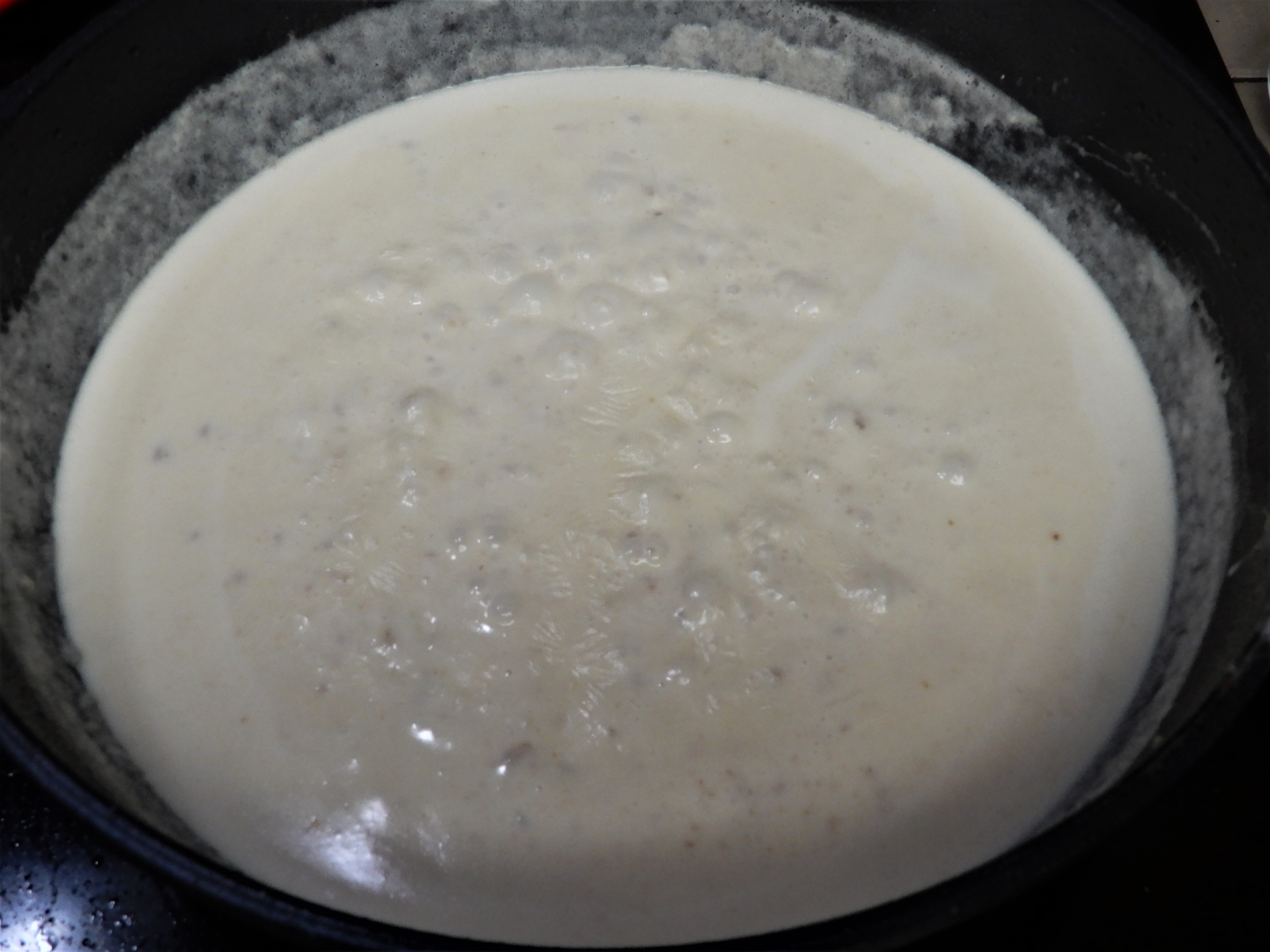 Pour chicken stock and heavy cream into the skillet. whisking until the mixture is smooth. Bring to a boil and add Parmesan cheese.