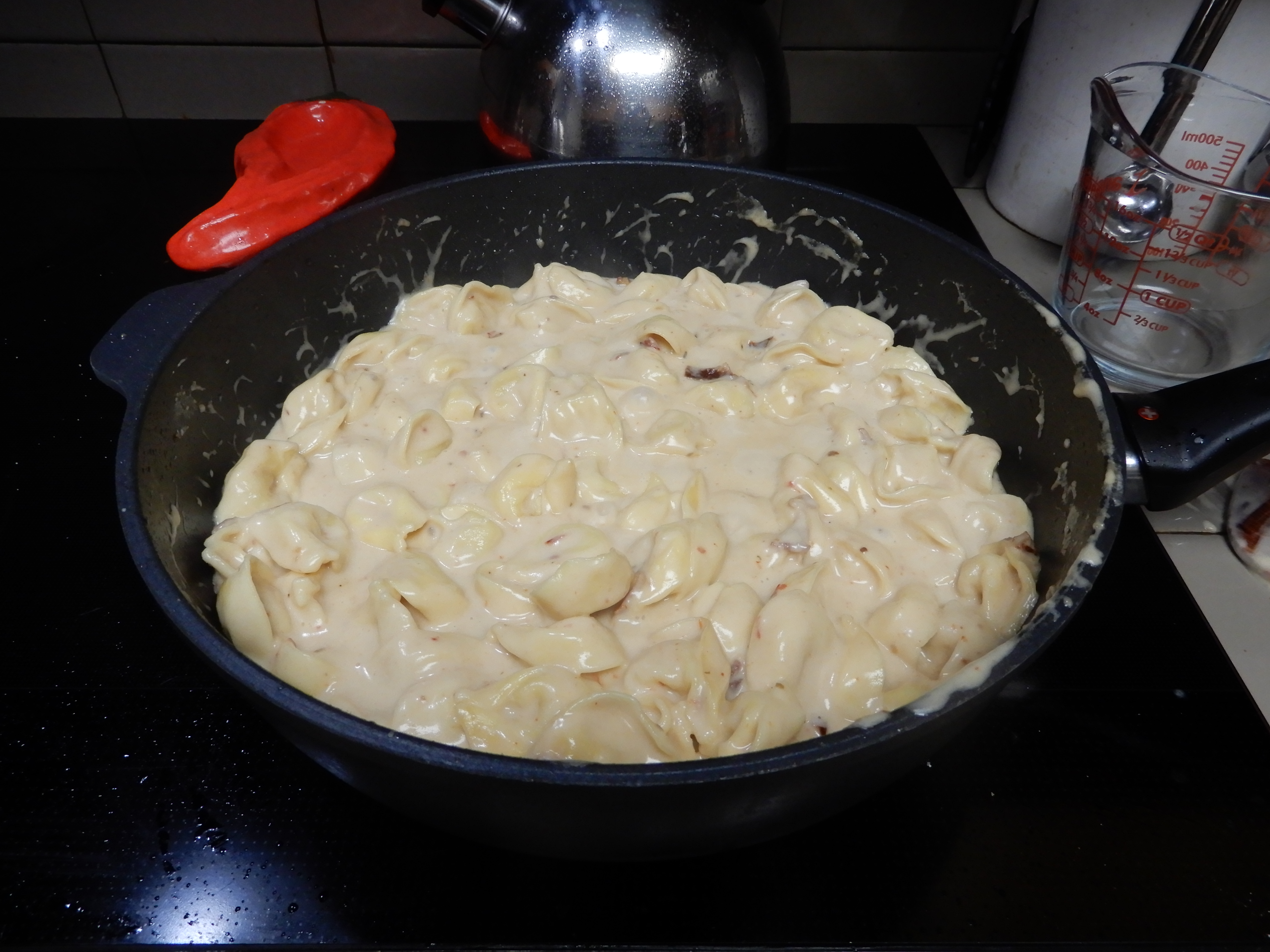 Turn heat down to medium and add tortellini, bacon bits, sun-dried tomatoes to the cream sauce. Cover skilled and let cook for 6 minutes stirring occasionally to make sure the tortellini is coated in the sauce and not stick to the bottom of the pan.