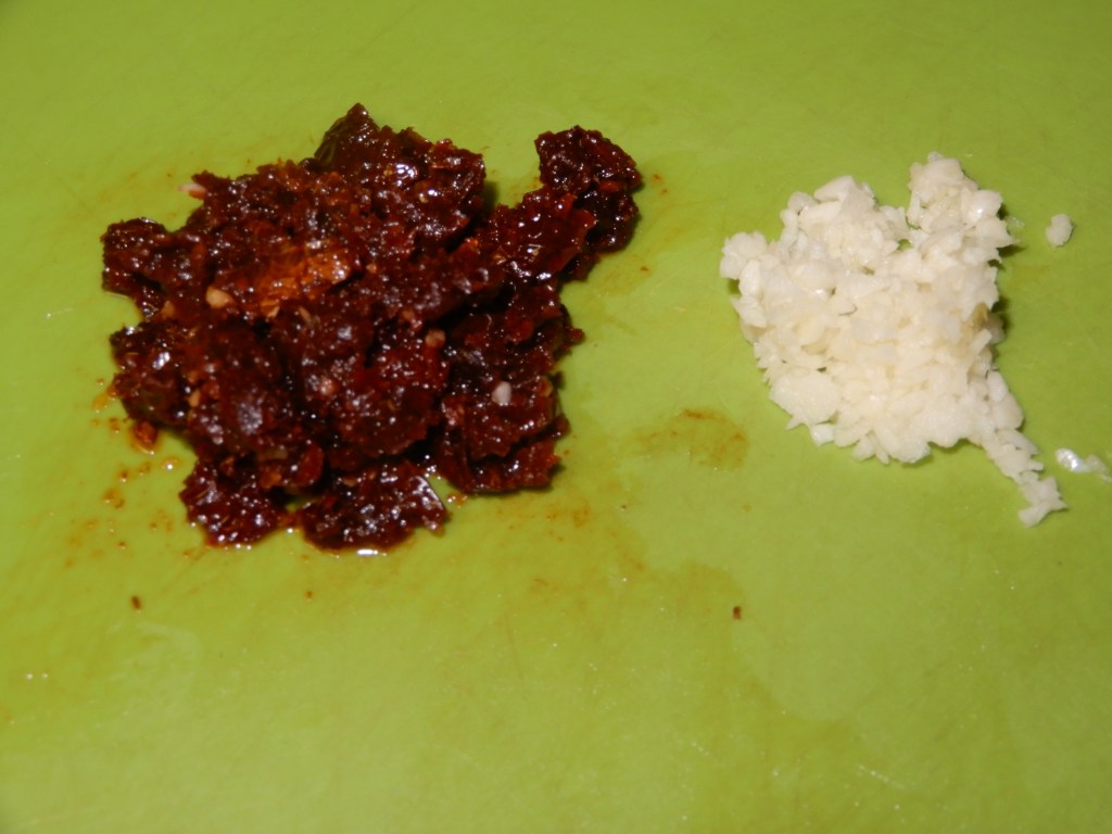 Peel and finely mince garlic, set aside. Roughly chop the sun-dried tomatoes and set aside.