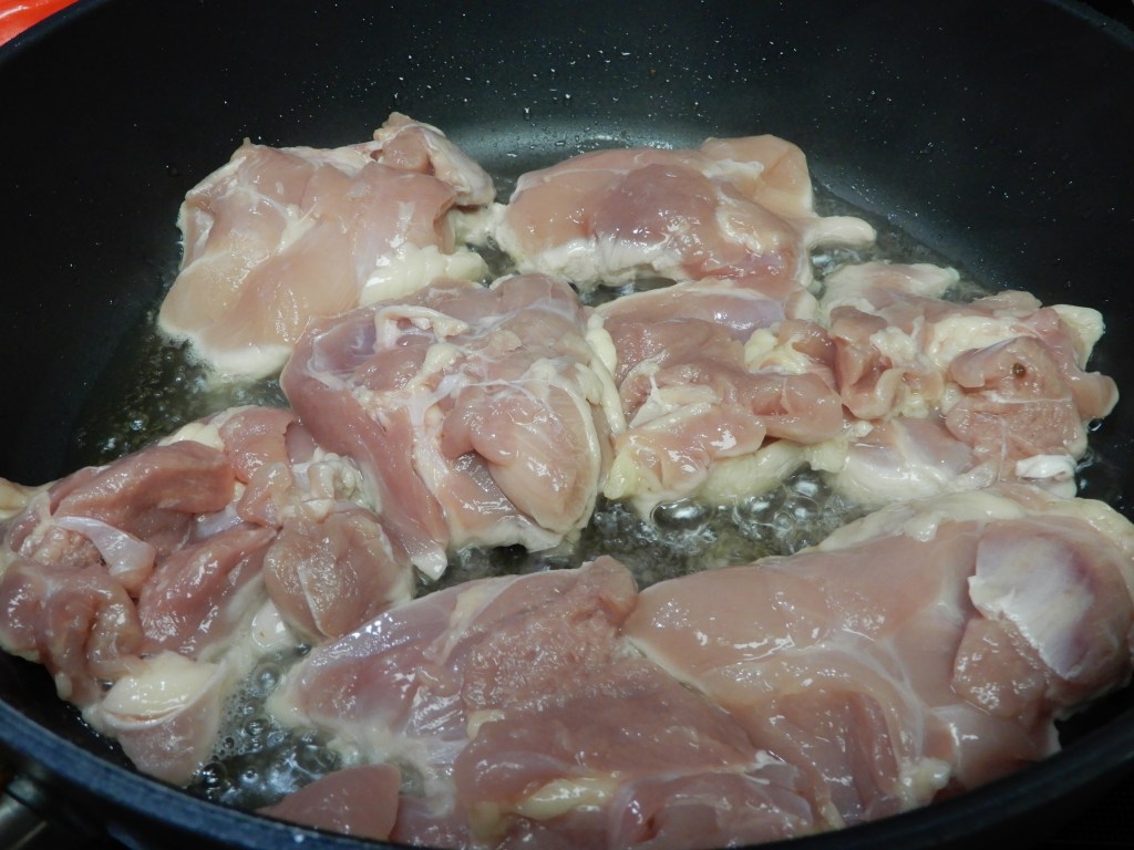 Cut chicken in half to create 8 small thighs. Season with salt and pepper, set aside.