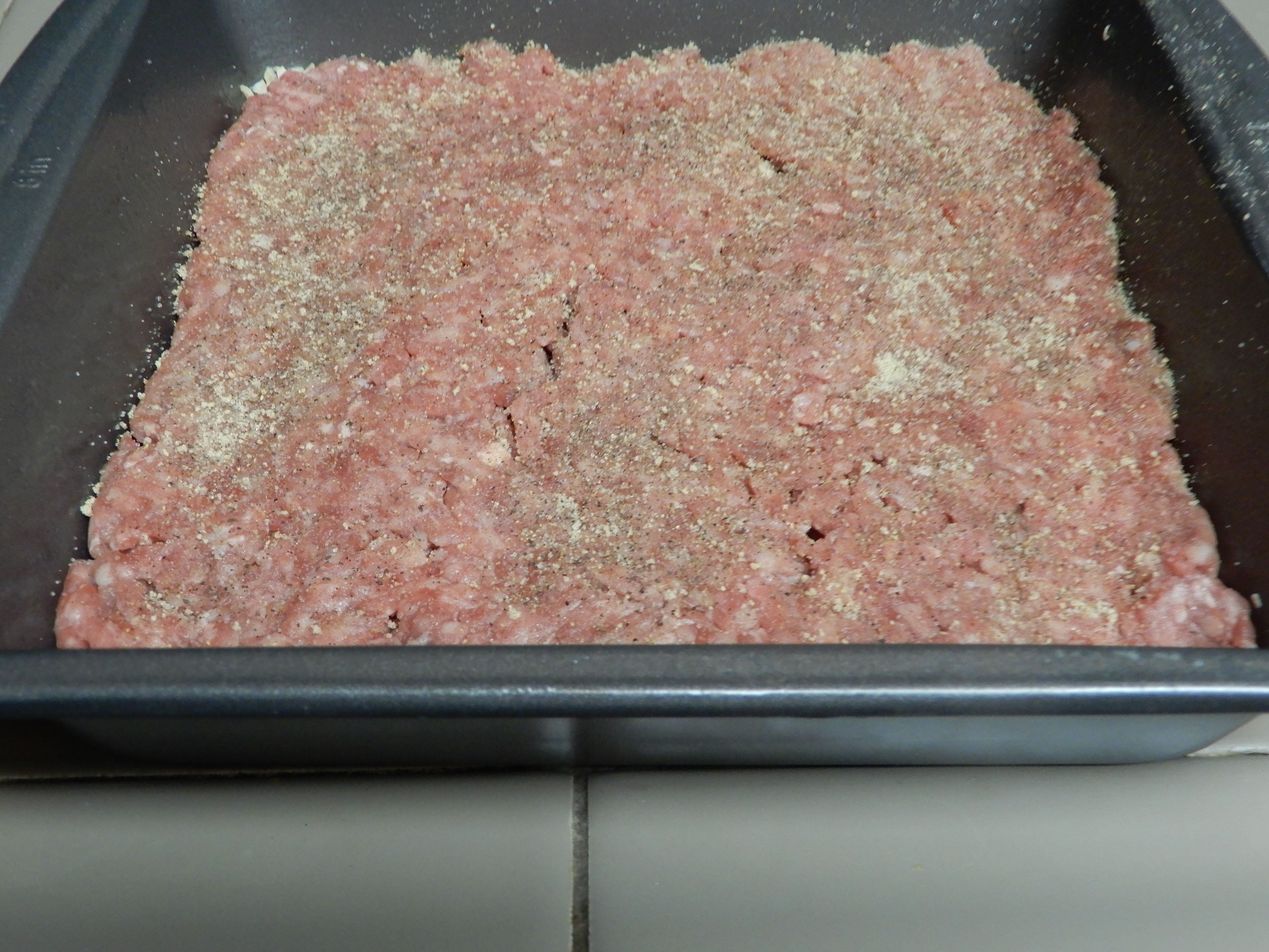 Gently press the ground beef out on a piece of plastic wrap. Season with salt and pepper. Carefully turn out on top of the onion flakes. Press evenly to make one big patty. Season a second time with seasoning salt and pepper.