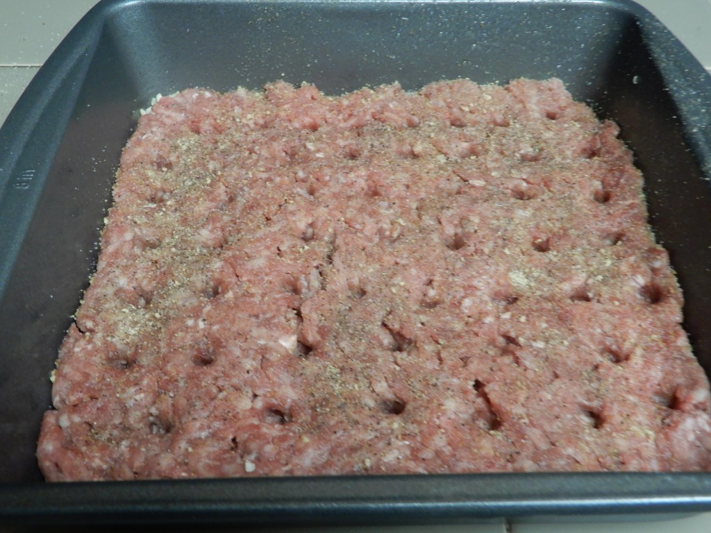 Using the handle of a wooden spoon, poke holes all over the burger. Place in the heated oven and bake for 15 minutes or until cooked through.