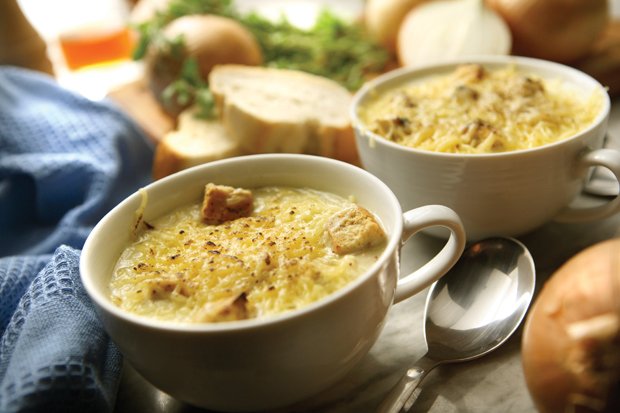 Heat oven to 350 degrees. Cut slices of bread diagonally and arrange on cookie sheet and bake until lightly toasted, about 5-7 minutes. Ladle soup evenly into four ovenproof bowls on cookie sheet and top with toasted bread, slightly pressing bread into soup. Generously distribute cheese evenly on top of each. Bake until cheese has melted and begins to brown, 12 to 15 minutes.