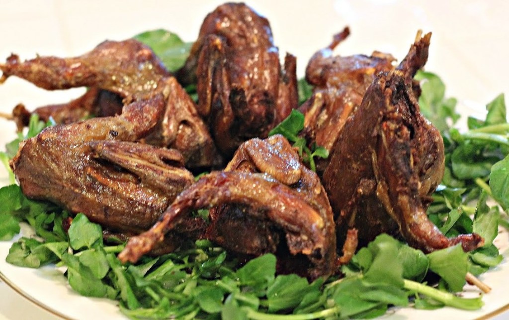 Drop one at a time into the fryer. Do not overfill fryer. Fry for 4 minutes, until golden brown and crisp. Remove to a baking tray. Drizzle quail with Sorghum Molasses and bake for 4 minutes.