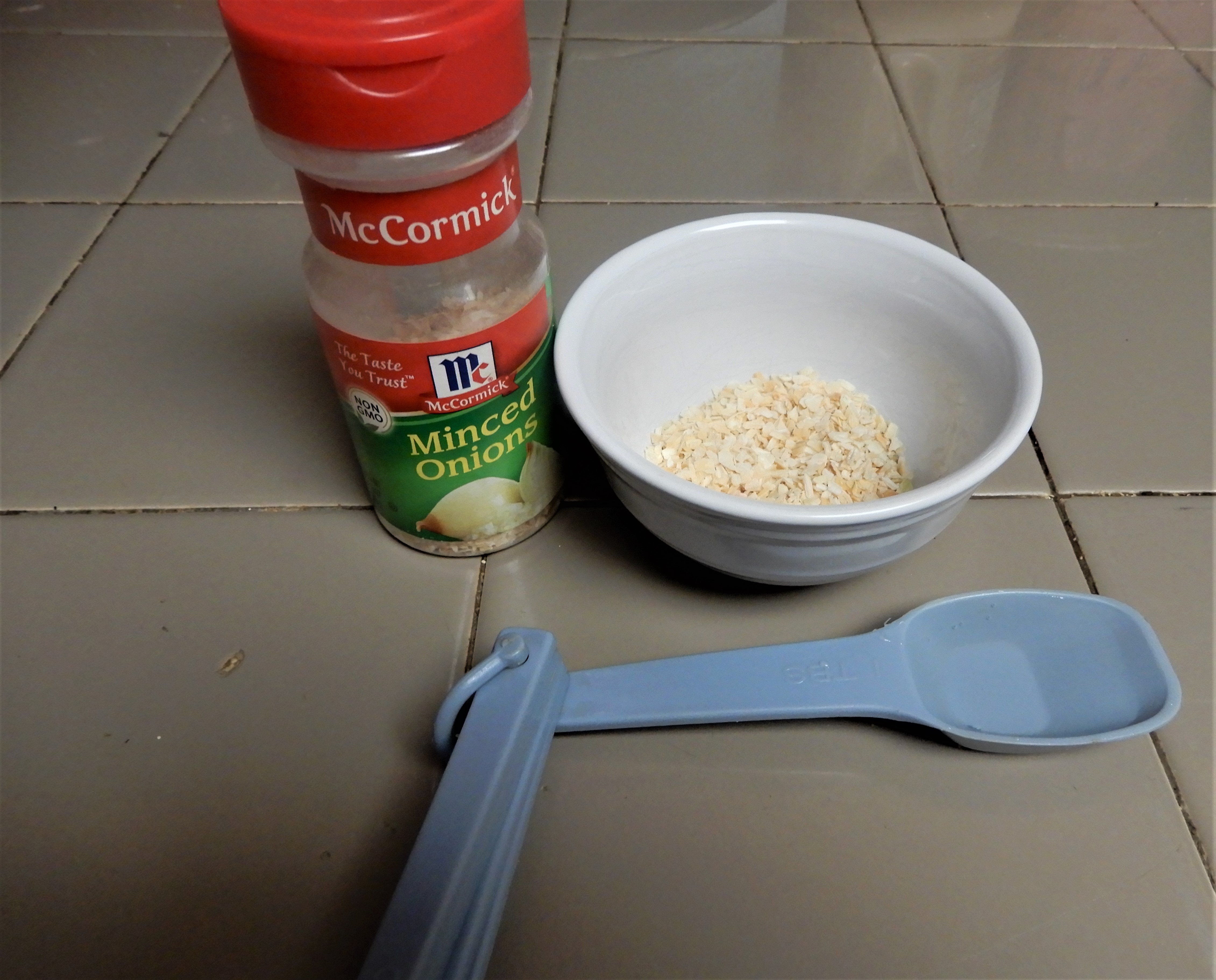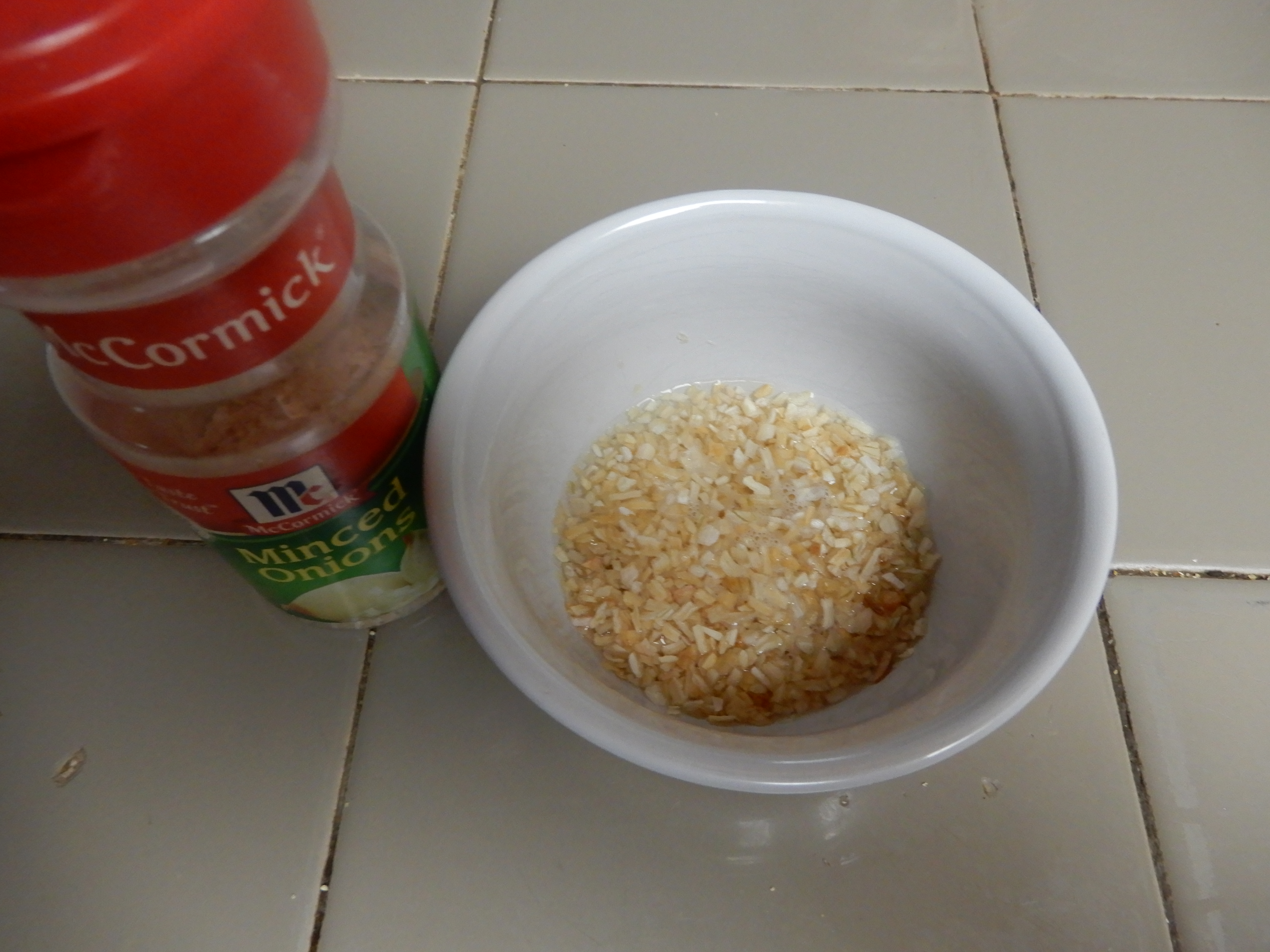 Place water and dried minced onion in a microwave safe small bowl. Heat for 2 minutes on high. Stir and let sit for 5 minutes for the onions to soften. Drain and set aside.