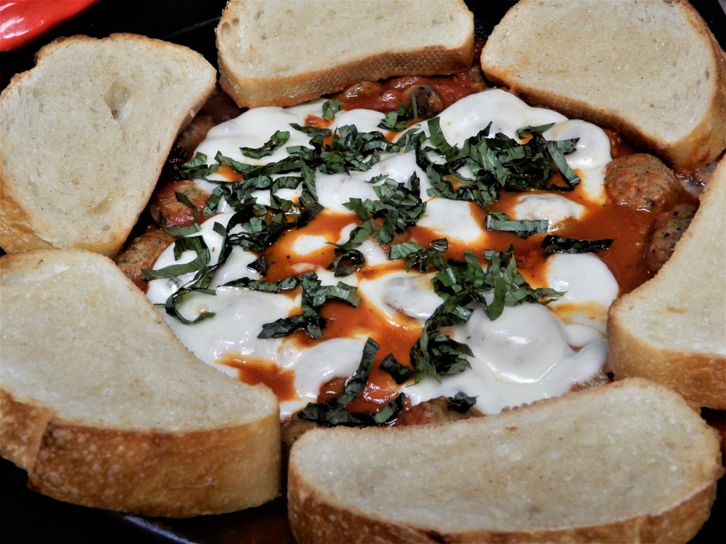 Once bubbly and toasted, remove skillet sub from oven and garnish with chopped basil.