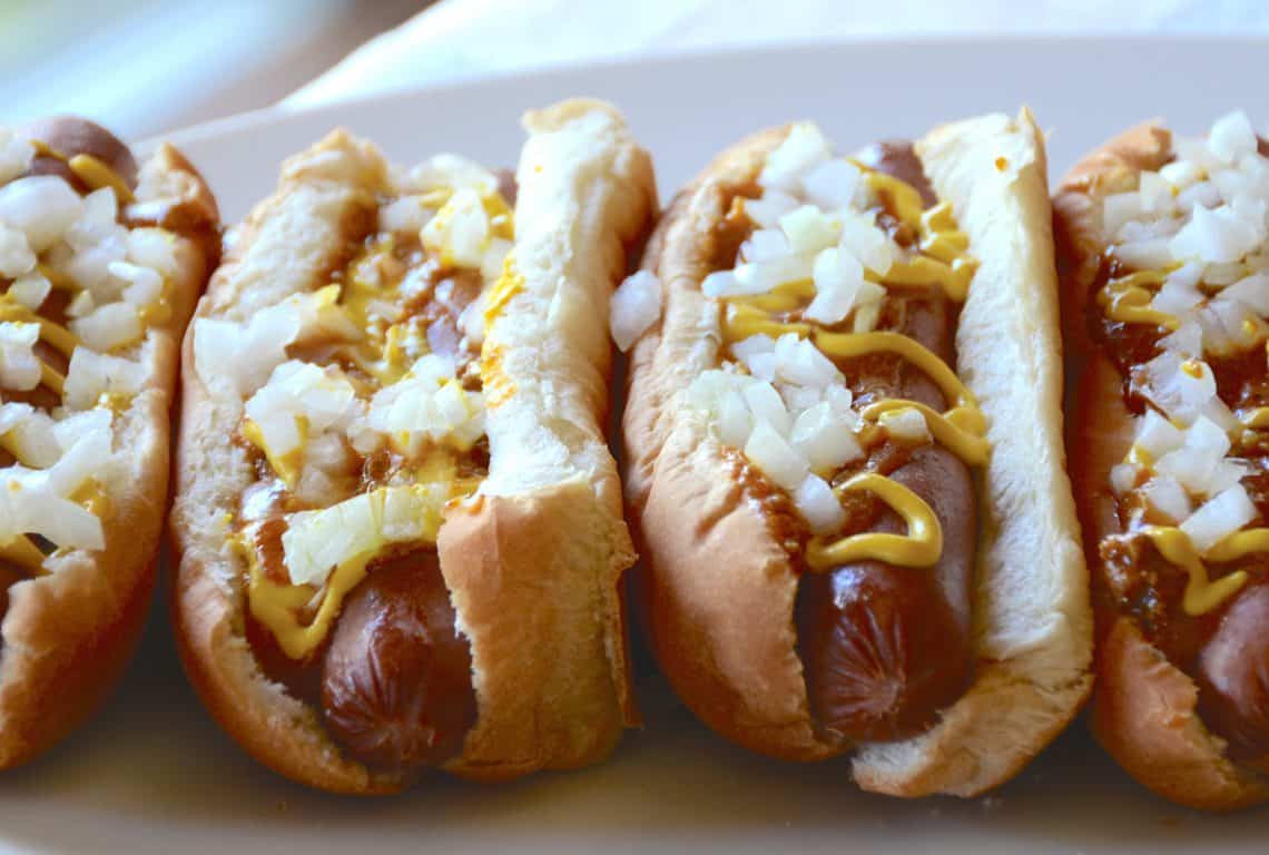 To assemble: Peel and dice the onion. Place a cooked hot dog into each warmed bun. Spoon a generous helping of the chili sauce across the top. Add a squeeze of prepared mustard, then a generous sprinkle of chopped onion. Serve immediately.