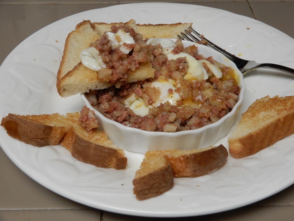 Spoon hash into shallow ramekins, smooth top. Place an egg on top of each serving. Place ramekin in the center of each plate. Cut toast into points, arrange on plate around ramekin.