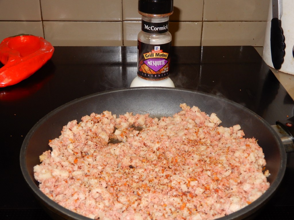 Empty corned beef hash into the skillet with 1 tablespoon bacon drippings. Stir in the shredded onion and juices. Spread hash evenly in the skillet. Season with Mesquite Seasoning and pepper to taste. Lower heat to medium, warm hash through.