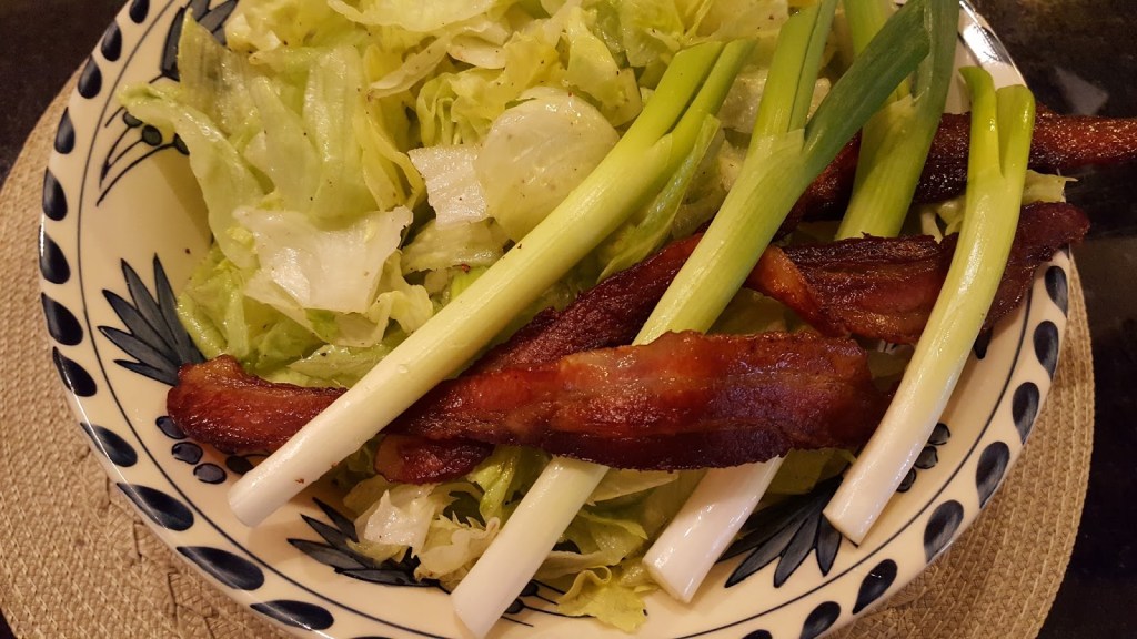 While the bacon cooks, chop the green onions and set aside. Rinse lettuce, tear into bite-size pieces and set aside.